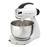 Combining 12 variable speeds and a powerful torque-control motor, this 450-watt stand mixer provides superior mixing control and maintains speed regardless of the mixing load. The unit ensures thorough, even mixing by offering dual-motor three-way beating action where one motor drives the beaters, each turning in opposite directions, and a second motor drives the bowl. The bowl speed increases and decreases automatically as the beater speed is increased and decreased. Simply slide the bowl selector lever on the front of the unit to the left when using the small bowl and to the right when using the large bowl. For added convenience, the head and beaters are off-center to the bowl to make it easier to add ingredients during mixing, and the mixer's tilt-back head simplifies removal of the mixing bowl and attachments. The eject button, located on the top of the handle, releases the attachments for easy cleaning by hand or in the dishwasher. Attachments include stainless-steel wire whisks for whisking cream, egg whites, light batters, and cake mixes; stainless-steel "v-groove" beaters for creaming butter and sugar, plus mixing heavy cake mixes; and stainless-steel dough hooks for kneading dough and other heavy mixtures. A user guide with recipes is also included. Housed in heavy-duty die-cast metal with non-slip rubber feet for stability, the stand mixer measures 16-7/8 by 8-3/4 by 18 inches and carries a two-year limited warranty.